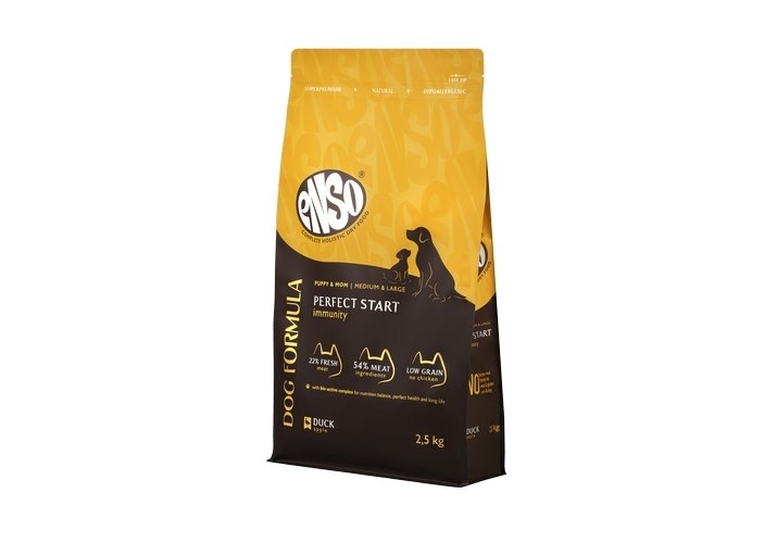 ENSO Dog Formula Perfect start – сухой полнорационный корм для щенков от 1 месяца, беременных и кормящих собак мелких и миниатюрных пород со свежей уткой с добавлением яблок.