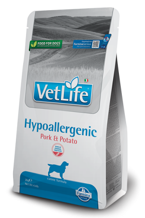 Farmina Vet Life Dog Hypoallergenic Pork & Potato - гипоаллергенное диетическое питание для собак страдающих пищевой аллергией или пищевой непереносимостью. Также рекомендован как вспомогательное средство для улучшения трофических функций кожи