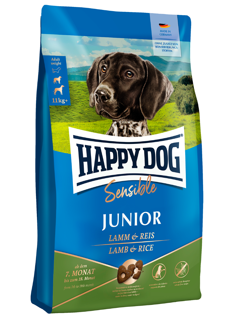 Happy Dog Junior Lamb and Rice - это корм для чувствительных молодых собак с 7 до 18 месяцев.