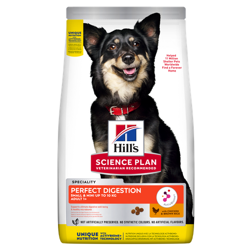 Hill's Science Plan PERFECT DIGESTION корм для взрослых собак мелких пород, с курицей и коричневым рисом содержит технологию ActivBiome+, эксклюзивную смесь пребиотиков Hill's, которая помогает быстро питать и поддержать баланс уникального микробиома вашего питомца.