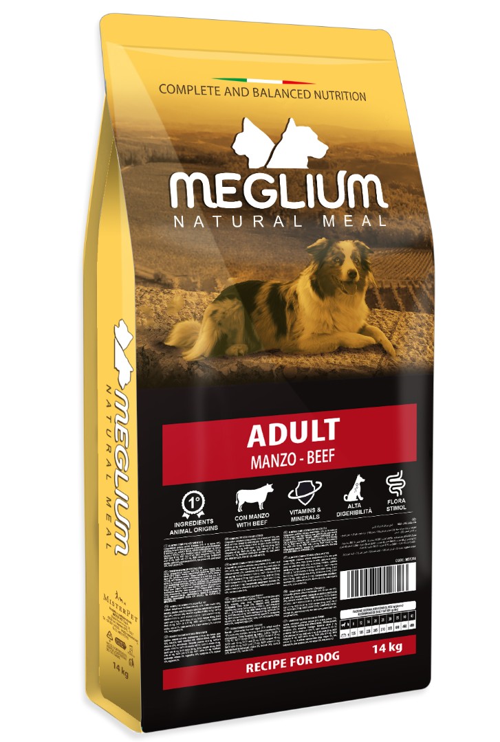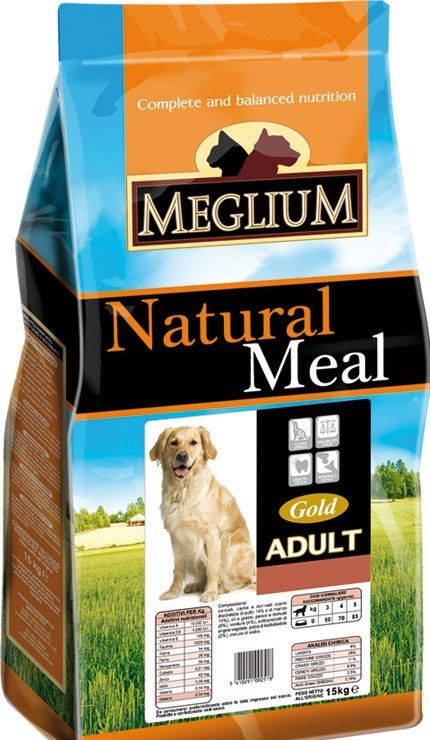 Meglium Adult GOLD главным ингредиентом здесь служит натуральное диетическое мясо – смесь говядины и курятины. А в качестве гарнира производитель выбрал сочетание кукурузы, пшеницы и кукурузной муки – зерновых, которые хорошо усваиваются в организме хищника. Кроме всего прочего, корм производится с применением инновационных технологий, которые позволяют сохранять в ингредиентах как можно больше полезных веществ и витаминов. Сбалансированная формула рациона обеспечит организм Вашего воспитанника всем, что нужно для поддержания идеального здоровья и отменной физической формы. Говядина и курятина, богатые белками, аминокислотами, железом, фосфором, кальцием и витаминами группы В, зарядят собаку жизненными силами, улучшат объем мышц, наладят работу кровеносной системы, укрепят кости и зубки. Умеренная жирность рациона защитит собаку от набора лишнего веса, углеводы из зерна послужат источниками «медленной» энергии и обеспечат длительное чувство сытости. Кроме того, злаки содержат клетчатку, которая положительно влияет на пищеварение, улучшает обмен веществ, выводит шлаки и токсины из организма. Чтобы у собаки была красивая, мягкая, блестящая шерсть и здоровая кожа, в состав Meglium Adult Gold включили жирные кислоты Омега-3-6. А еще в рационе есть природные антиоксиданты, витамины и пребиотики – эти добавки нужны для повышения иммунитета, замедления старения, поддержания работы всех внутренних органов и систем.