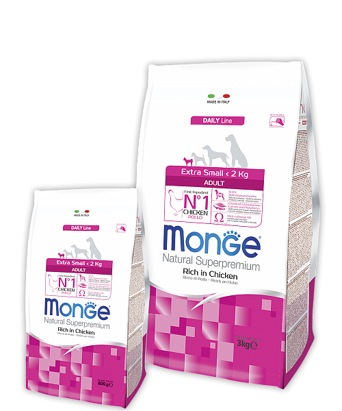 MONGE SUPERPREMIUM DOG EXTRA SMALL ADULT - это полноценный сбалансированный рацион для взрослых собак миниатюрных пород с нормальной физической активностью.
