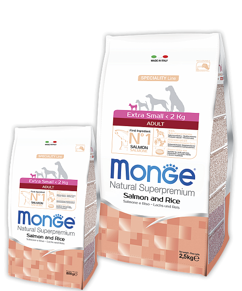 MONGE SPECIALITY LINE EXTRA SMALL ADULT SALMONE AND RICE - это полноценный сбалансированный рацион для взрослых собак миниатюрных пород с особыми потребностями. Богат омега-3 и омега-6 жирными кислотами, которые позволяют предупредить воспалительные процессы и сохранить здоровье кожи и блеск шерсти вашего питомца.