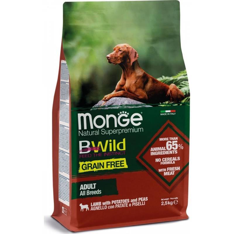 Monge Dog BWild Adult All Breeds (Ягненок) - это полноценный сбалансированный беззерновой рацион для взрослых собак всех пород, склонных к аллергической реакции на глютен, а также для молодых животных, ведущих активный образ жизни.