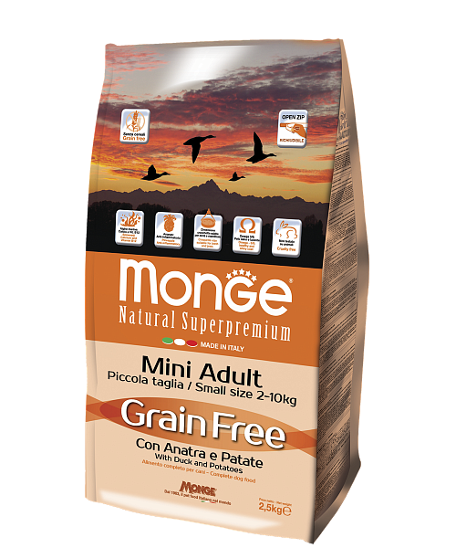 MONGE GRAIN FREE MINI ADULT CON ANATRA E PATATE - это полноценная сбалансированная беззерновая диета для собак мелких пород, склонных к аллергической реакции на глютен. Этот аппетитный высокоусвояемый корм поистине является уникальным продуктом в линейке кормов Monge, поскольку только он создан на основе мяса утки, которое считается одним из наиболее ценных источников полноценного белка и витаминов группы B. Не содержит зерновых культур.
