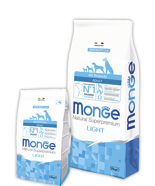 MONGE SPECIALITY LINE ALL BREEDS ADULT LIGHT SALMONE - это полноценный сбалансированный рацион для взрослых собак всех пород с особыми потребностями, склонных к набору избыточного веса. Корм разработан специально для снижения и поддержания идеального веса собаки. Богат омега-3 и омега-6 жирными кислотами, которые позволяют предупредить воспалительные процессы и сохранить здоровье кожи и блеск шерсти вашего питомца.