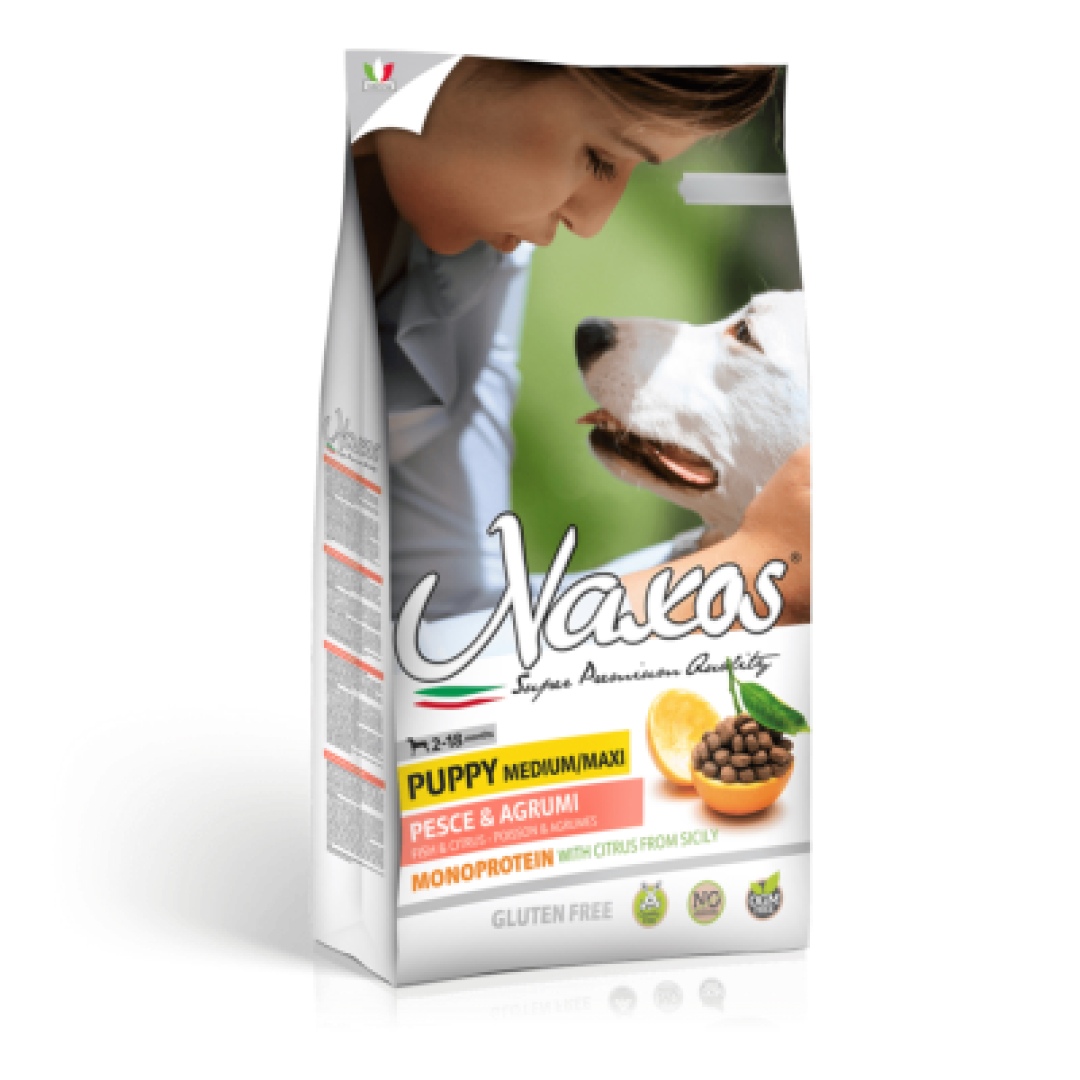 Naxos Puppy Medium/Maxi – Fish & Citrus– РЫБА С ЦИТРУСОМ ДЛЯ ЩЕНКОВ СРЕДНИХ И КРУПНЫХ ПОРОД Naxos Puppy Medium/Maxi– корм с рыбой и цитрусовыми рекомендуется для роста щенков среднего размера, которые имеют особые физиологические потребности и потребности в питании.