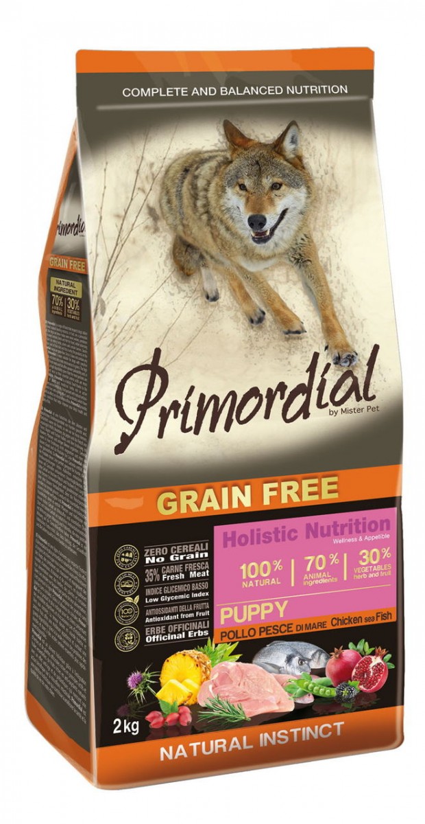 Корм Примордиал - это не только мясо, это также 30% растительных продуктов, содержащих множество активных веществ и эфирных масел, это корм класса холистик, идеально подходящий для сбалансированного питания собак. Специально подобранные овощи, гарантирующие постоянный и низкий гликемический индекс, фрукты, травы и лекарственные растения, в том числе Розмарин, Одуванчик, оказывающий благоприятное воздействие на печень, Гранат и Шиповник, богатые витаминами и натуральными антиоксидантами, Ананас, способствующий пищеварению, пребиотики Fos и Mos, нормализующие кишечную флору - благодаря всем этим компонентам корм для собак Примордиаль, улучшает здоровье и качество жизни Вашей собаки.Состав: Свежая рыба (35%), дегидрированное куриное мясо (24%), горошек, картофель, куриный жир (11%), боб обыкновенный, льняное семя (2%), сушеная мякоть свеклы, пивные дрожжи, мука из морских водорослей (0,3%), сушеная мякоть цикория, фруктолигосахариды FOS (0,2%), дрожжевые продукты (MOS 0,2%), юкка Шидигера (0,03%), расторопша пятнистая (Silybum marianum L.) (0,02%), дегидрированный стебель ананаса (Ananas sativus L.) (0,02%), дегидрированный гранат (Punica granatum) (0,02%), дегидрированные плоды шиповника (Rosa Canina L., R. Pendulina L.) (0,002%), дегидрированная ежевика (Rubus ulmifolius Schott.) (0,0006%), глюкозамина (100 мг/кг), хондроитина сульфат (50 мг/кг), экстракт розмарина.