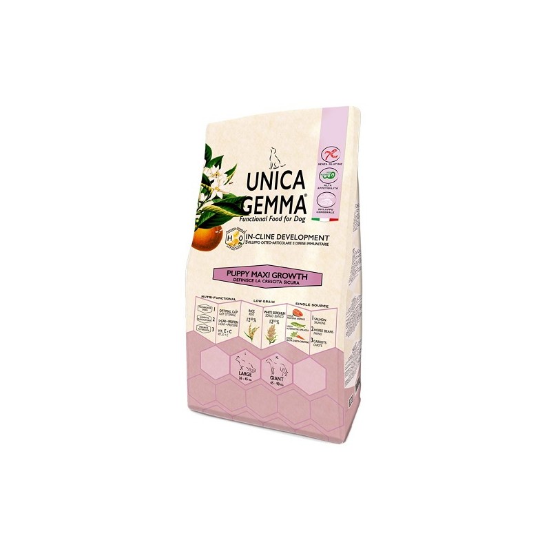 полнорационный сухой корм Unica Gemma Puppy Maxi с лососем, бобами и морковью для щенков крупных и гигантских пород от 2 месяцев. Puppy Maxi предназначен для собак с массой тела от 26 до 90 кг. Он специально разработан для развития, роста и укрепления мышечно-скелетной массы щенков. Корм Unica Gemma содержит все необходимые ингредиенты для правильного развития и роста Вашего питомца. Единственный источник белка – лосось, он способствует неврологическому развитию. В данном корме повышенное содержание белка и L-карнитина, которые способствуют накоплению безжировой массы, увеличению и укреплению мускулатуры щенка. Комплекс витаминов Е и С укрепляет иммунную систему и усиливает действие вакцин. Благодаря мёду и апельсину, корм обладает сильными антиоксидантными свойствами.
